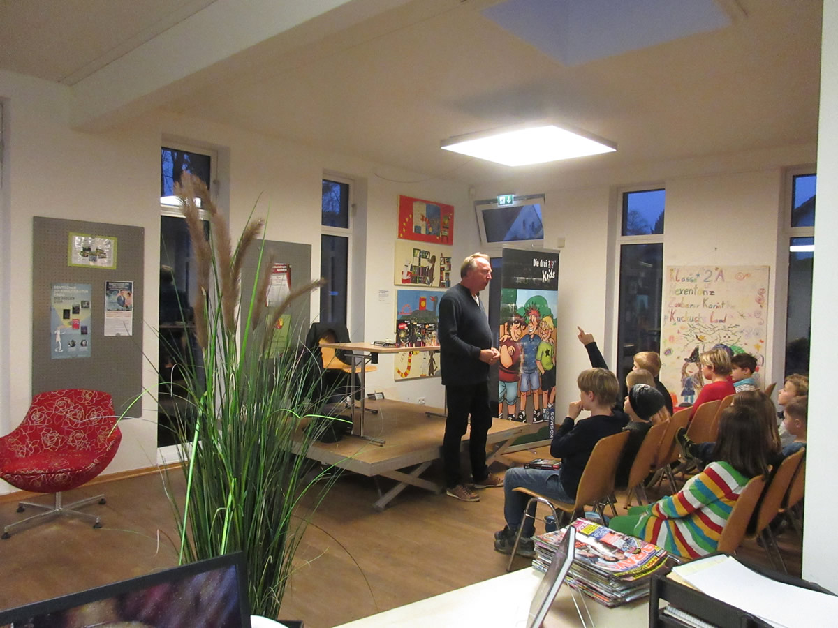 Er erzählte eine Menge interessantes über die drei ??? Detektive Justus, Peter und Bob, las einige spannende Kapitel aus seinem neuen Buch vor, machte Fingerabdrücke sichtbar und löste mit Hilfe der Kinder die schweren Ketten an der geheimen Truhe. Und hatte für jeden Besucher noch ein Autogramm parat.